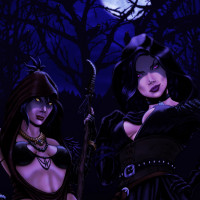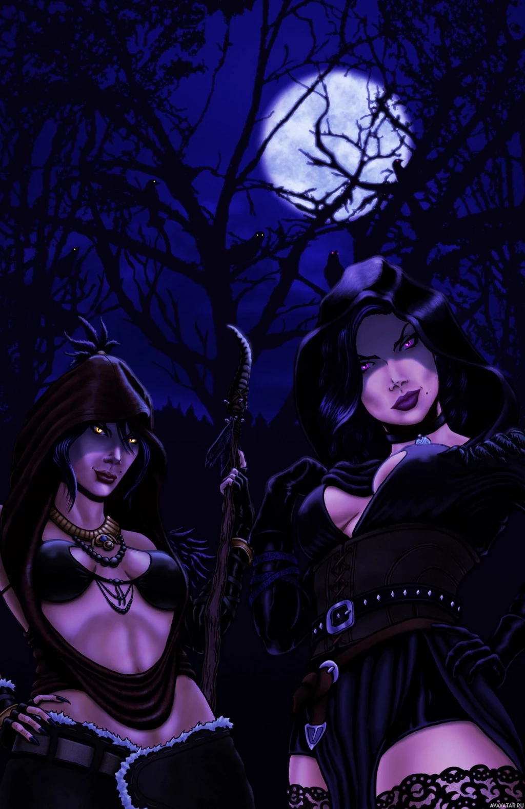 black hair and is dressed in a black outfit with various tattoos or markings visible on her arms and neck. Both characters are holding weapons; Yennefer has a sword at her side, while Morrigan has a bow. The moon is visible in the sky above them, adding to the eerie atmosphere of the scene. The style of the image suggests it's from a promotional material for the game or fan art inspired by the game.