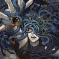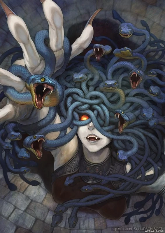 The image depicts a fantasy-themed artwork featuring a character who appears to be Medusa, the mythological Gorgon from