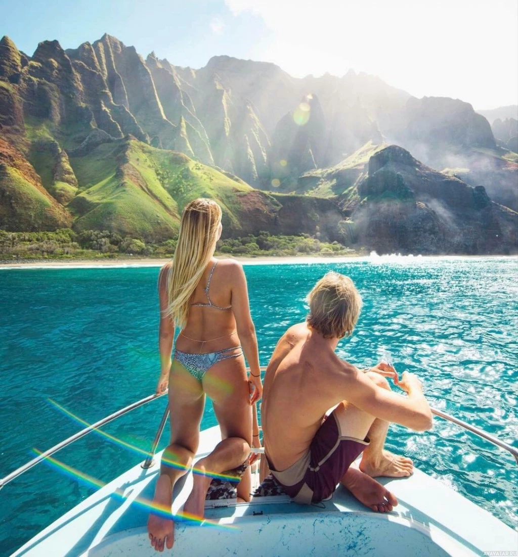 the beautiful coastline with lush green mountains in the background, which suggests that they might be enjoying a scenic tour or adventure on the water. The girl seems to be wearing a bikini, indicating it might be warm weather and possibly