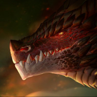This is an image of a fantasy dragon. The dragon has scales with shades of brown, red, and black patterns. It appears to be roaring or breathing fire. The background is dimly lit, which might suggest a scene from a dark fantasy setting.