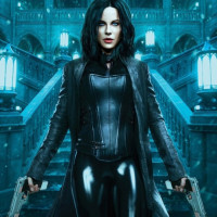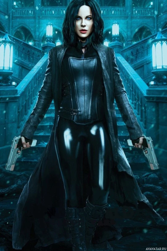 a female character wearing a tight-fitting black outfit, which resembles the attire of the character Selene from the Underworld film series. She is holding two guns pointed downwards, with