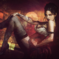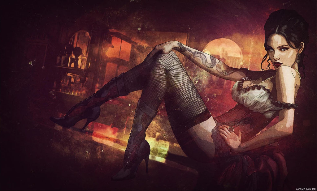 a brunette woman sitting in an indoor setting that has a dark and moody atmosphere, possibly resembling a smoky bar or club. She is wearing a black corset with a lace-up style, fishnet stockings, and