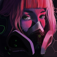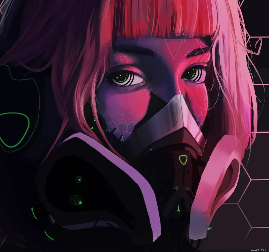 pink hair. She is wearing a respirator mask that has a futuristic, possibly
