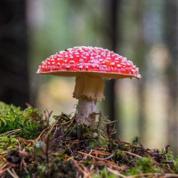 white spots on its cap. The mushroom is growing out of what appears to be mossy soil or rock. The background features