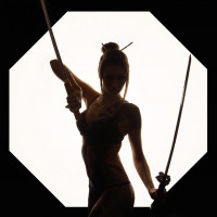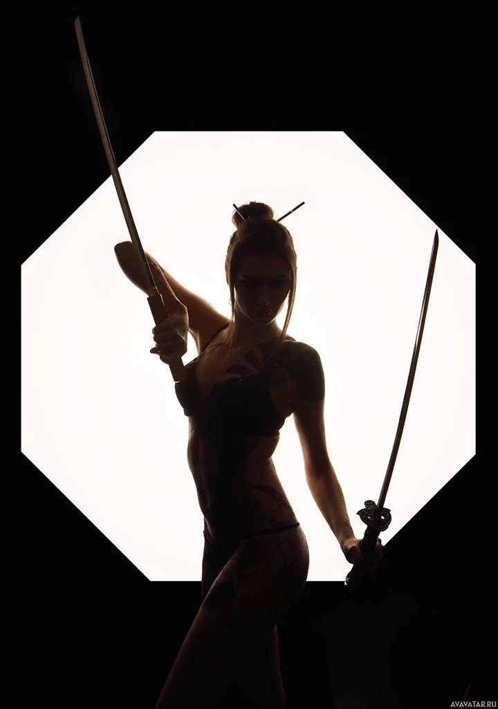 a silhouette of a girl, who appears to be in a stylized or dramatic pose. She is holding what looks like swords and seems to be wearing some sort of costume that could suggest she is portraying a character from a specific culture or narrative, possibly one that involves swordplay or