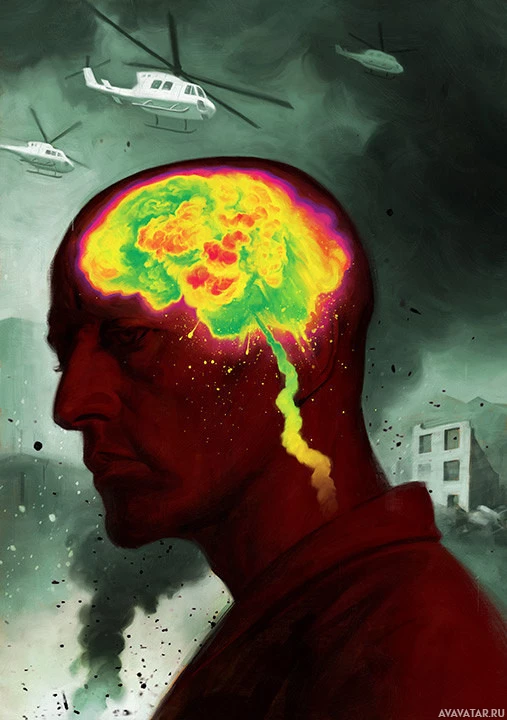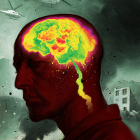 The image depicts a man's head, which has been artistically modified to have an explosion taking place within the brain. This is likely a metaphorical representation of
