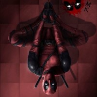 The image depicts a character known as Deadpool, who is upside down. He is wearing his signature red and black suit with white gloves, which are characteristic of his appearance in