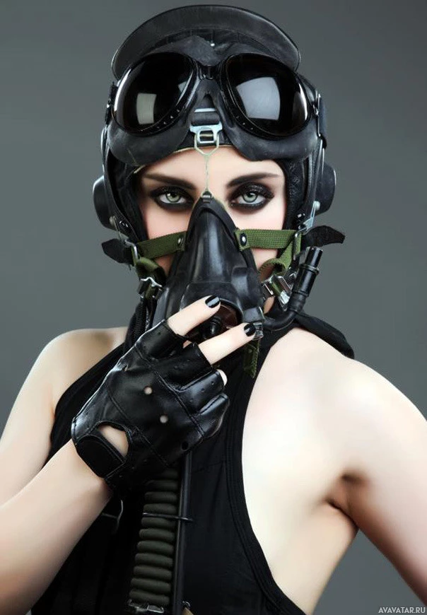 a gas mask and a military-style helmet with goggles. They are dressed in what appears to be