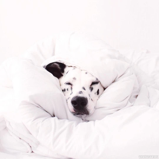 The image shows a dog lying down and wrapped in blankets, appearing to be asleep. The dog has a black and white