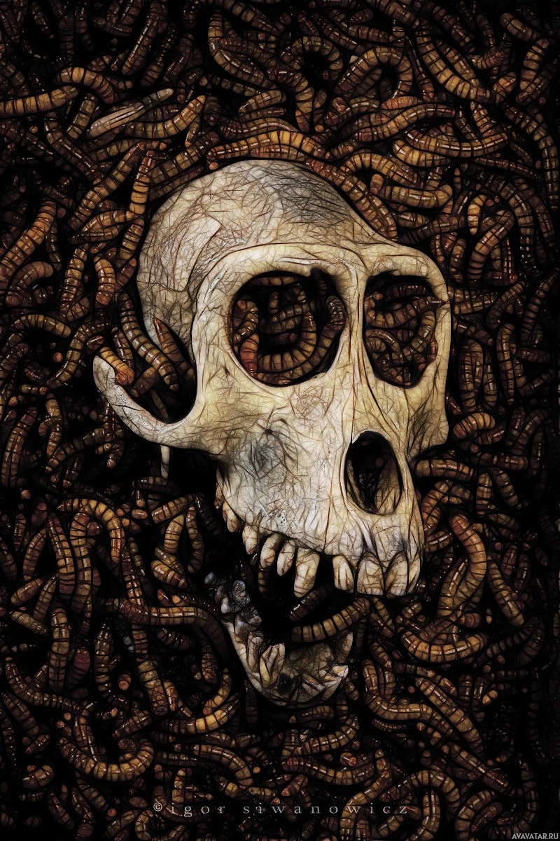 На картинке изображен череп, окруженный многочисленными червями. Череп кажется человеческим, и насекомые ползают по нему. Это может быть художественное представление смерти или упадка.