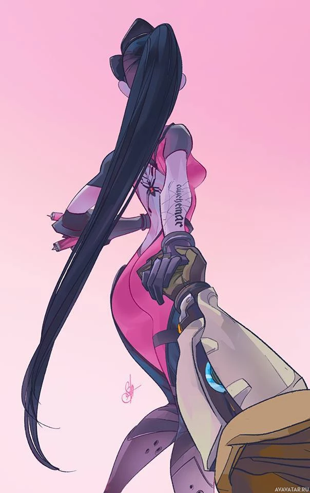 animated characters from the game "Overwatch." One character appears to be a female assassin with