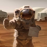 На снимке изображен астронавт, стоящий на поверхности Марса, на что указывает бесплодный ландшафт и красная каменистая местность. На заднем плане также есть структуры, напоминающие места обитания или убежища, предназначенные для занятия человеком в марсианской среде. Это может быть фильм или концептуальная иллюстрация, изображающая жизнь в марсианской колонии.