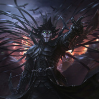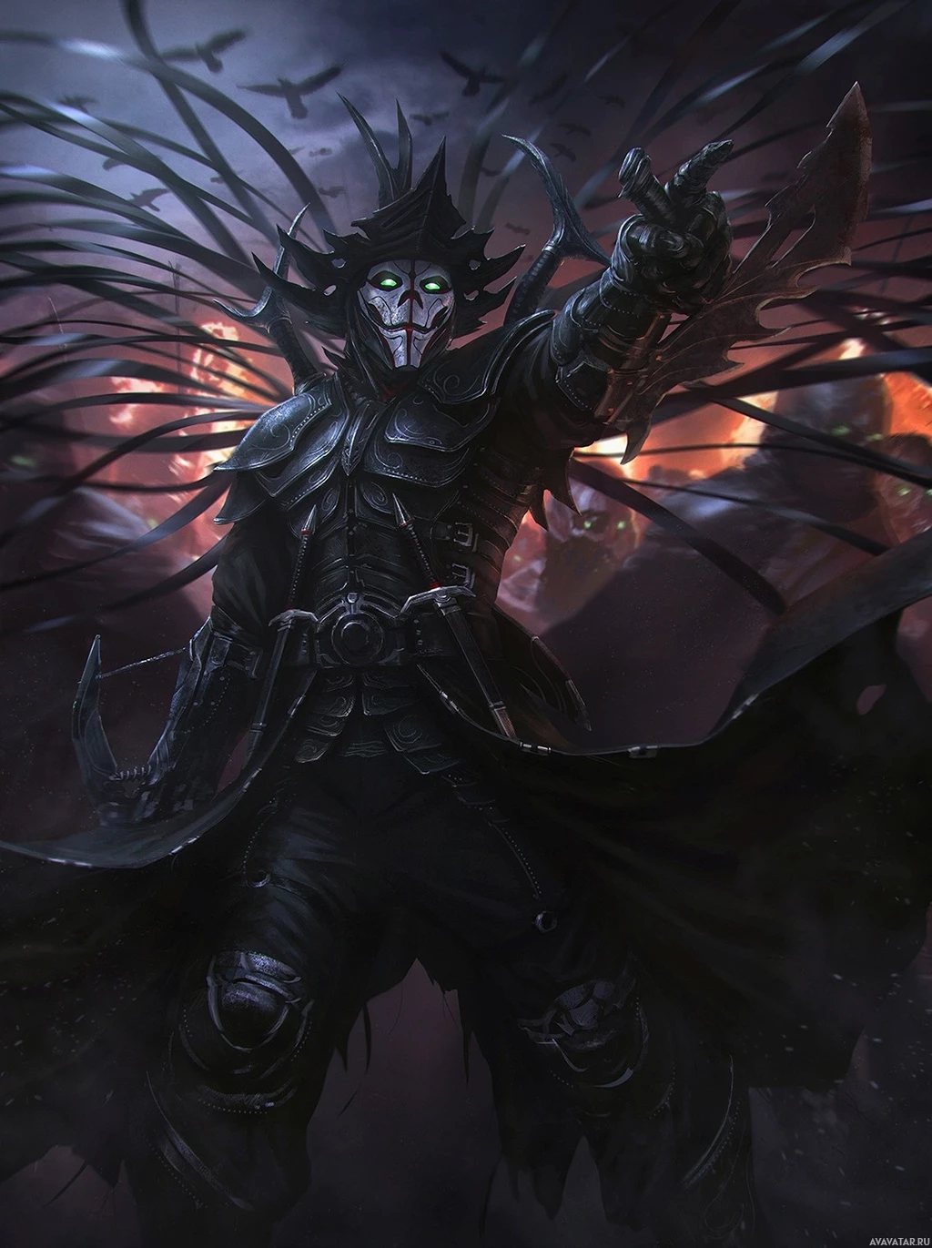 a glowing eye, suggesting an otherworldly or supernatural quality. They are also adorned with what appears to be a costume consisting of dark fabrics and
