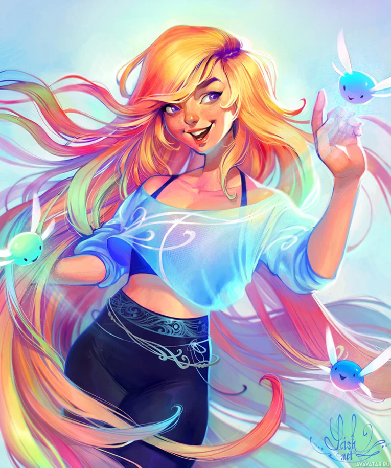 a playful pose, as if she's enjoying herself. Around her are small creatures that resemble Pokémon or similar