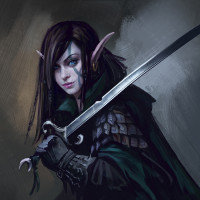 a fantasy character, commonly known as a drow. This character is portrayed with long dark hair and striking