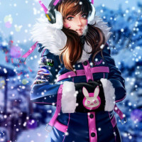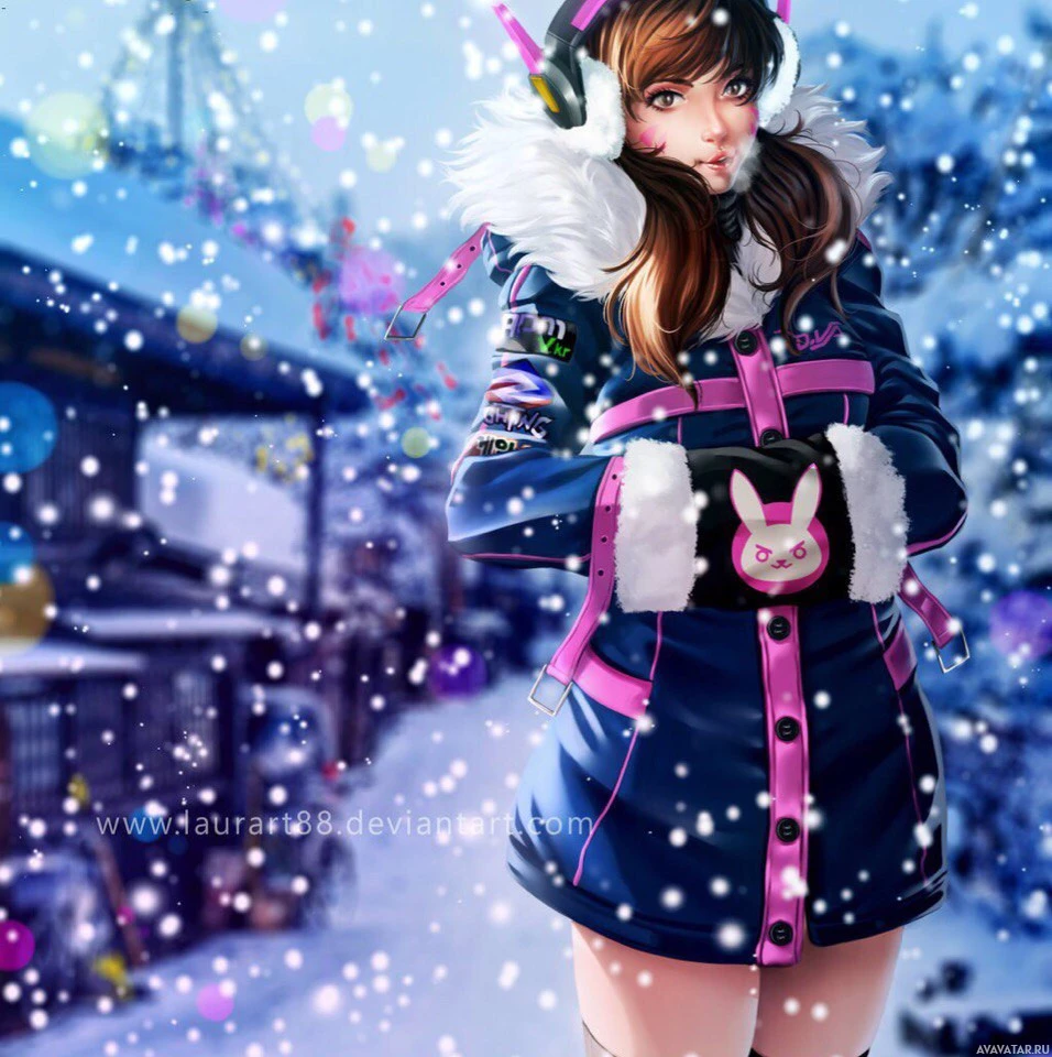 an animated character dressed in winter attire, including a coat with the hood up and fur trim around the collar. She is also wearing gloves and has headphones on her ears, suggesting she might be using them to listen to music or communicate with others. In the background, there appears to be