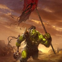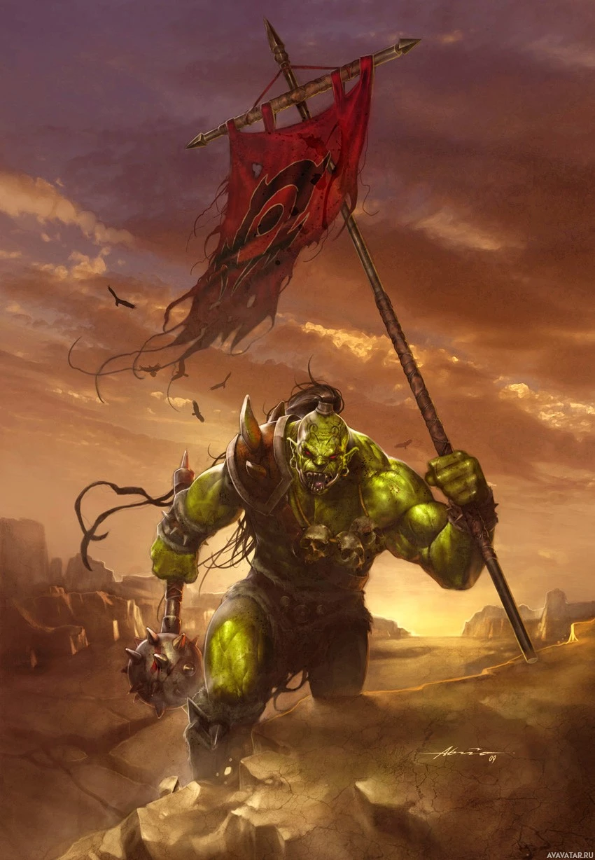 a fantasy character who appears to be an Orc from the Warcraft universe. This character is depicted holding a flag with