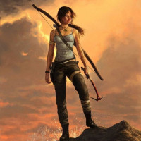 a female character, Lara Croft, standing on a rocky outcrop with a scenic view of what appears to be the ocean or sea in the background. She is holding a bow and arrow, suggesting she might be engaged in an action or
