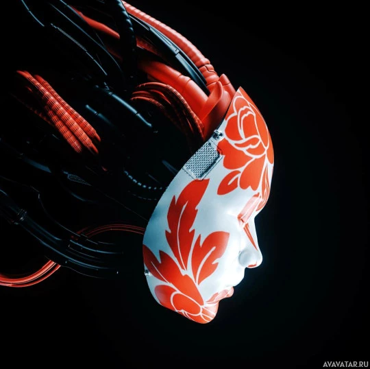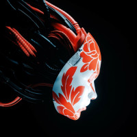 The image shows a robot with what appears to be a human-like face. It has intricate detailing, particularly around the eyes and mouth area, which gives it an almost anthropomorphic appearance. The robot is wearing a mask that is decorated with red and white patterns, possibly resembling Japanese art or design. There's also some
