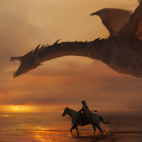 The image depicts a fantasy scene with a dragon in the sky. In the foreground, there is a rider on horseback looking up at the dragon. This image is commonly associated with fantasy elements and themes.