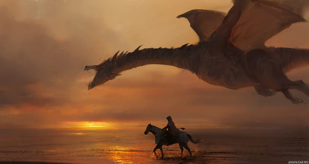 На картинке изображена фантастическая сцена с драконом в небе. На переднем плане всадник верхом смотрит на дракона. Этот образ обычно ассоциируется с элементами фэнтези и темами.