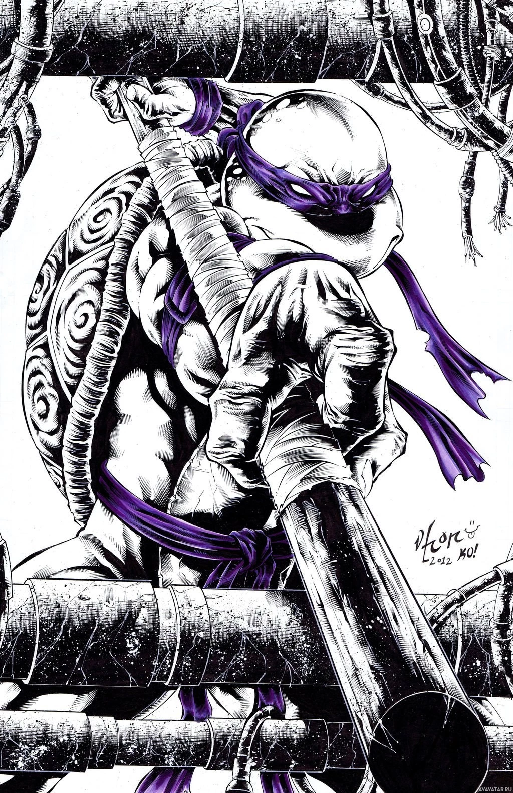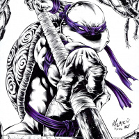 The image depicts an illustrated character who is recognized as Donatello, a member of the Teenage Mutant