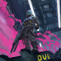 a sense of action or combat, as indicated by the smoke and pink splashes around the character, suggesting some sort of explosive event. The background features mechanical structures that hint at