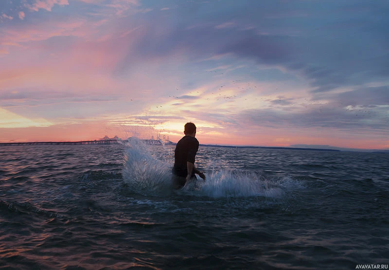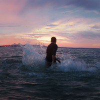 water sports. The focus is on the individual and the water around them, capturing a moment of action or possibly reflection during what appears to be an end-of-day setting near the sea.