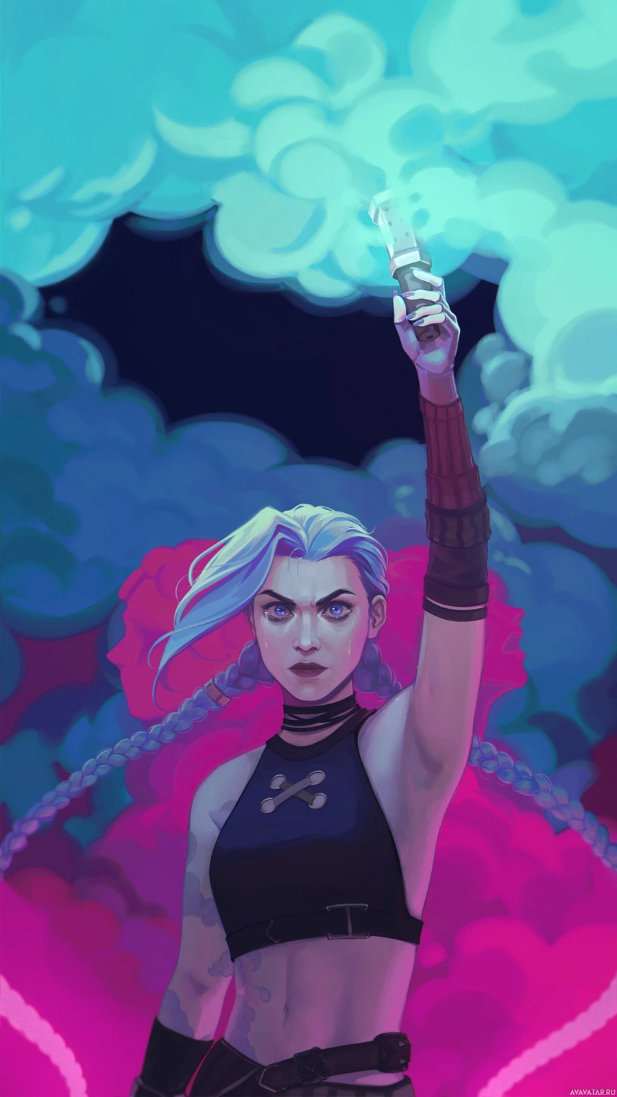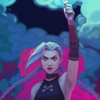 League of Legends (LoL), and it's likely she represents Jinx, a champion within the game known for her chaotic behavior and agility. The image has a dynamic quality to it, capturing the essence of Jinx's energetic and unpredictable nature.