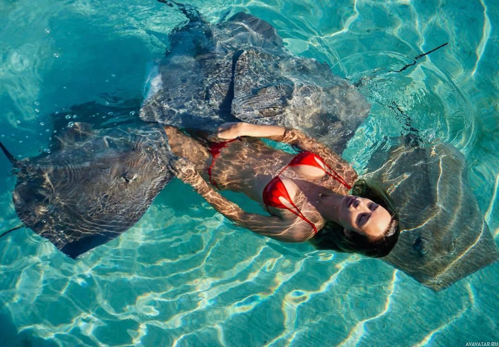 blue ocean water. They are surrounded by two stingrays that appear to be resting or floating near them. The stingrays have a large and rounded