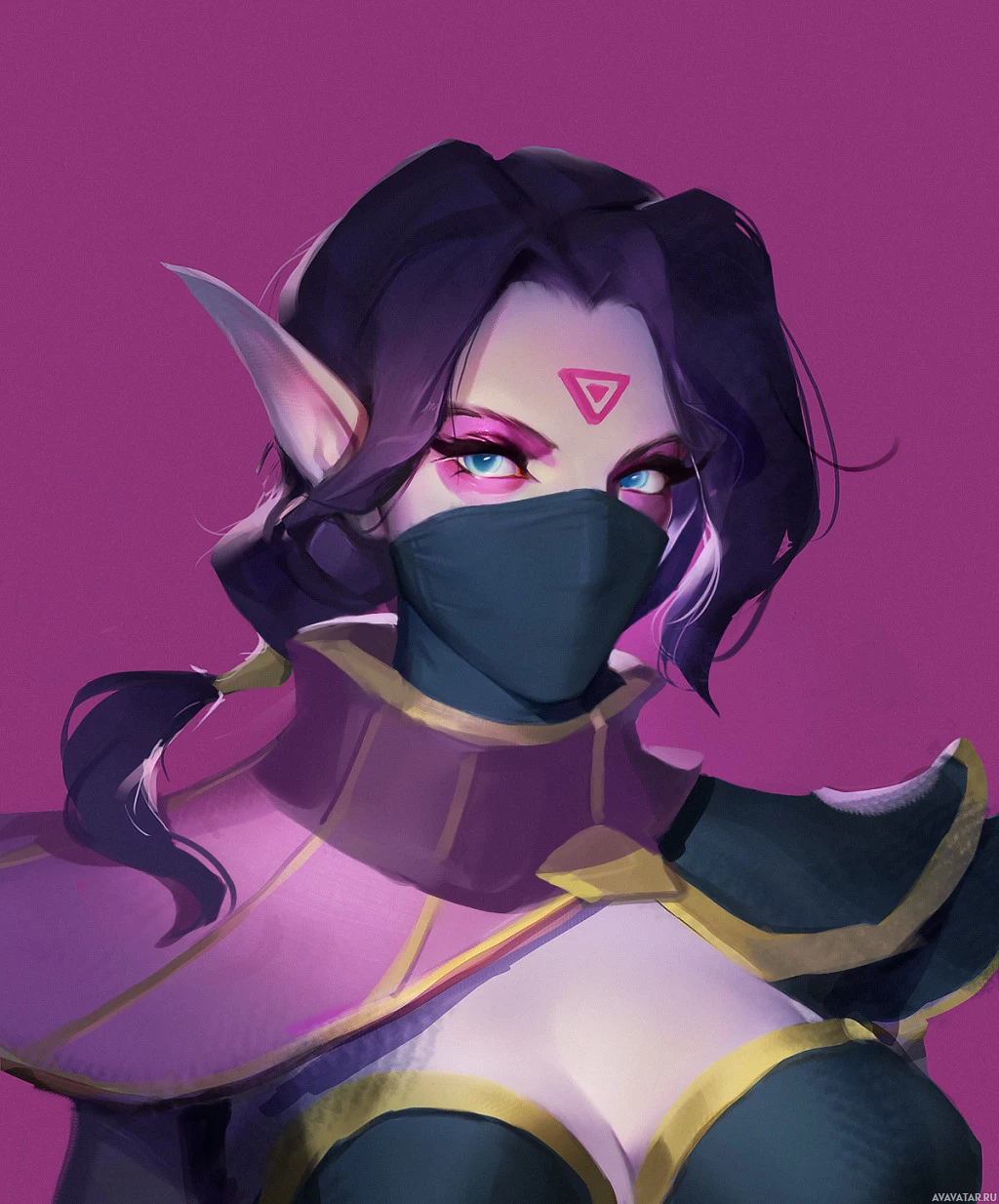 a Templar Assassin, wearing armor with a purple and black color scheme, which seems to be part of her outfit. Her hair is styled in a way that covers her ears, which are pointed, a common feature in fantasy illustrations or games. She has