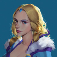 На картинке изображен анимированный персонаж из видеоигры Dota 2. Этот персонаж известен как Кристалл Мейден, и она является частью игрового состава героев с уникальными способностями и сильными сторонами. Картина захватывает ее стилизованным образом, типичным для рекламных или художественных представлений персонажей в игровом сообществе.