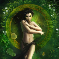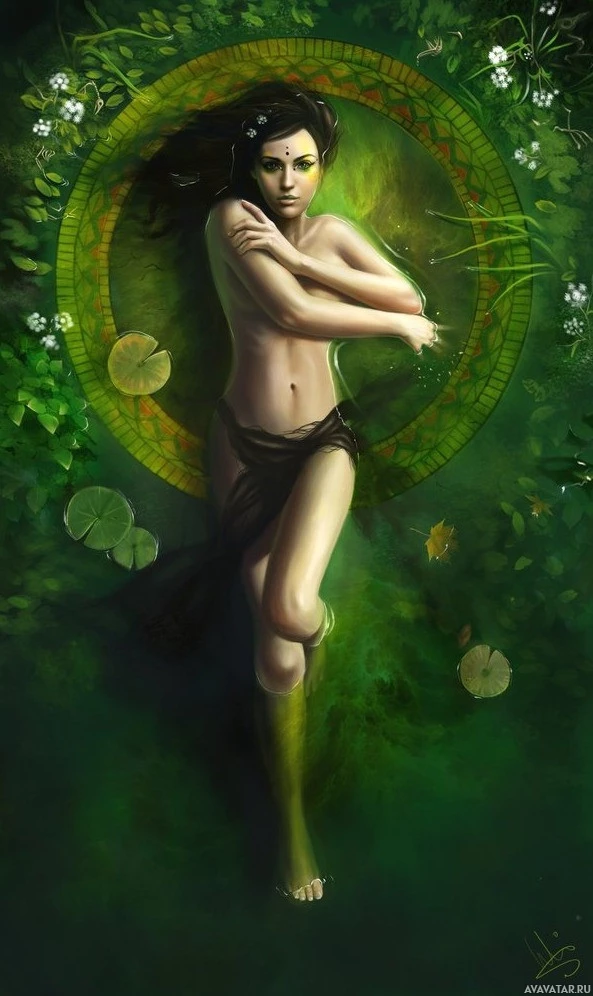 long hair and is depicted as being naked but covered by leaves or foliage that surrounds her body, giving the impression of nature embracing her. There are