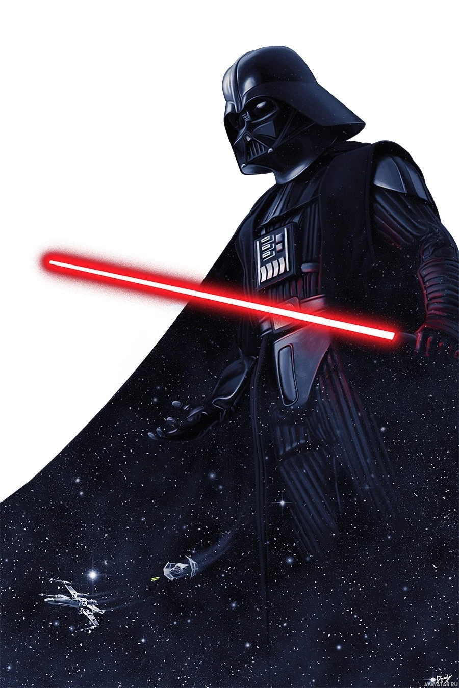 На картинке изображен Дарт Вейдер, персонаж из франшизы «Звездные войны». Он показан в своей культовой черной броне с красным световым мечом, удерживаемым в правой руке. На заднем плане изображена галактическая сцена, которая предполагает, что он плавает в пространстве.