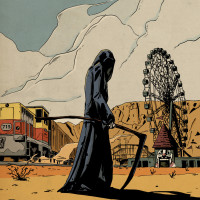 book page featuring an illustration of the character Death. This is indicated by the skull and scythe, which are traditional symbols associated with this figure in