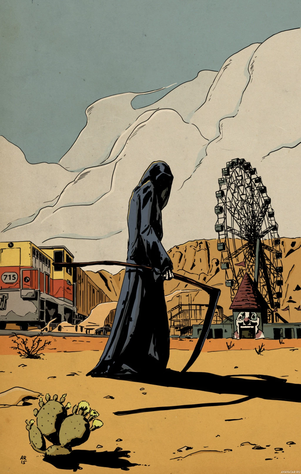various mythologies and stories. Death is depicted standing in a desert setting with