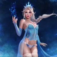 blue accents. Her hair is braided and appears to be made of icicles or ice. The background features