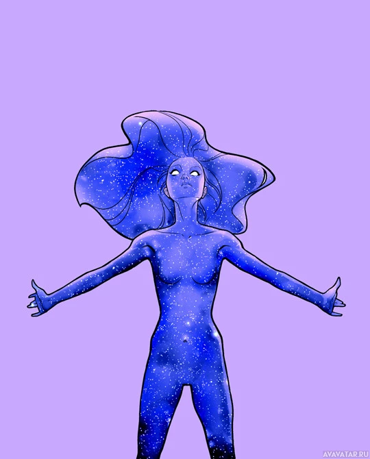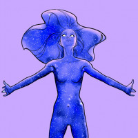 a young woman. She is depicted with flowing hair, and her attire seems to be made of or resemble stars. She stands with her arms outstretched as if embracing the universe or celebrating something cosmic in nature. Her expression is one of joy or wonder, fitting the celestial theme suggested by the star-like patterns on her clothing and the background that mimics a galaxy.