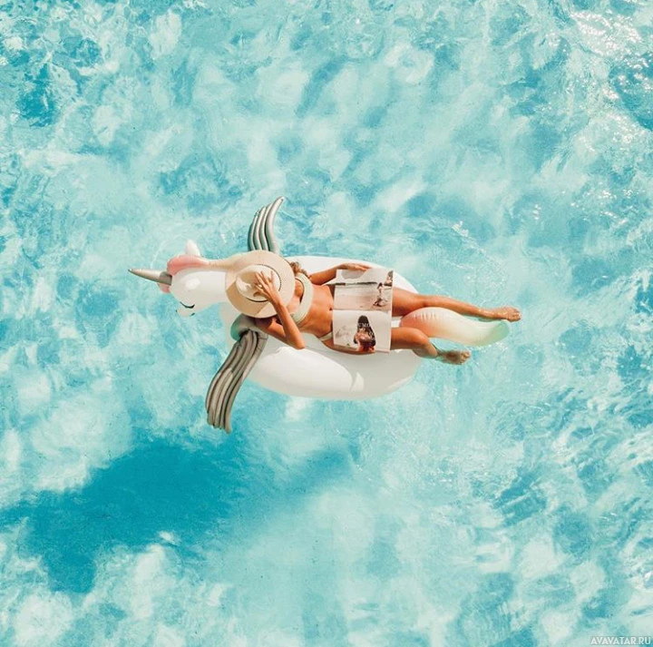 На картинке изображен человек, лежащий на надувной игрушке для бассейна фламинго, которая имеет форму единорога. Человек носит купальники и шляпу, читает журнал или книгу. Они находятся в воде, вероятно, на пляже или в бассейне.