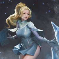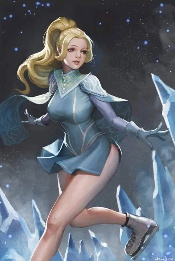 blonde hair, wearing a blue and white outfit that resembles armor. She is set against the backdrop of what looks like a frozen landscape with ice formations, suggesting she might be in