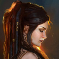 На картинке изображен женский персонаж с каштановыми волосами, закрытыми глазами и вдумчивым выражением лица. Она носит украшения и имеет подробную прическу, которая включает косы. Ее одежда, кажется, оформлена таким образом, что предполагает фэнтези или историческую обстановку.