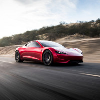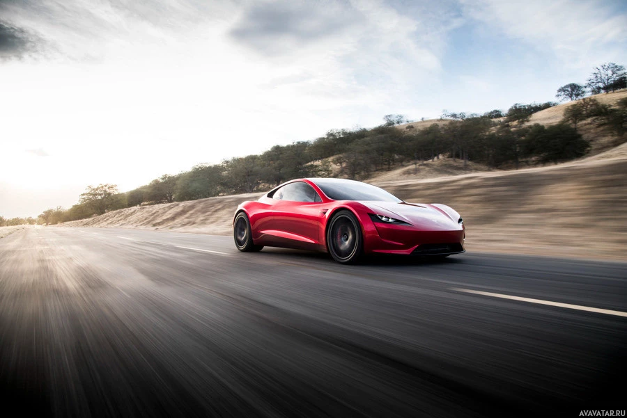 The picture shows a red sports car on a road, captured during what appears to be either sunrise or sunset given the warm light in the sky. It's a dynamic scene that likely emphasizes the speed and sleek design of the vehicle.