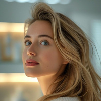 blonde hair. Her expression is neutral with her lips slightly parted, giving