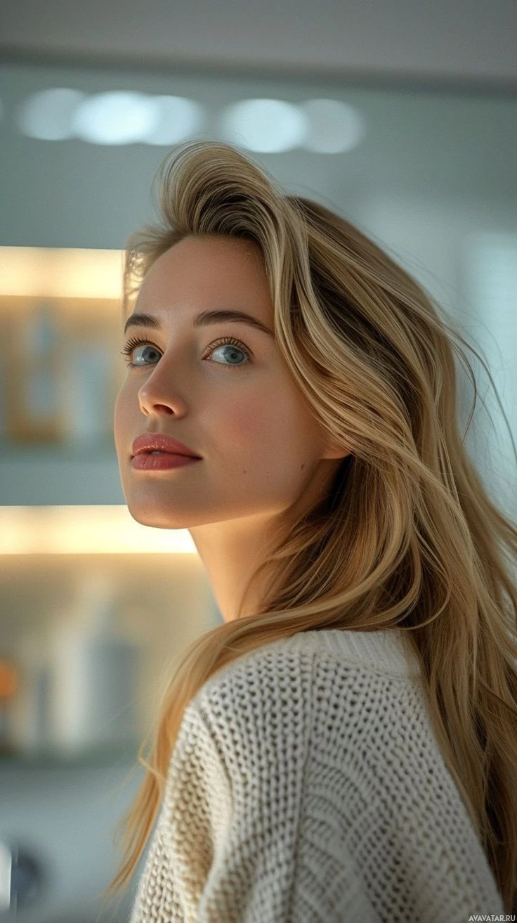 an indoor setting with warm lighting that seems to be coming from the direction she is looking in. The overall style of the image is elegant and understated.