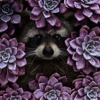 На картинке изображен енот, выглядывающий из-за плотного скопления фиолетовых цветов, возможно, пансионов. Ракун, кажется, находится в бдительном и любопытном состоянии, с широко открытыми глазами и глядя прямо в камеру. Цветовой контраст между темным мехом енота и ярко окрашенными цветами создает яркий визуальный эффект.
