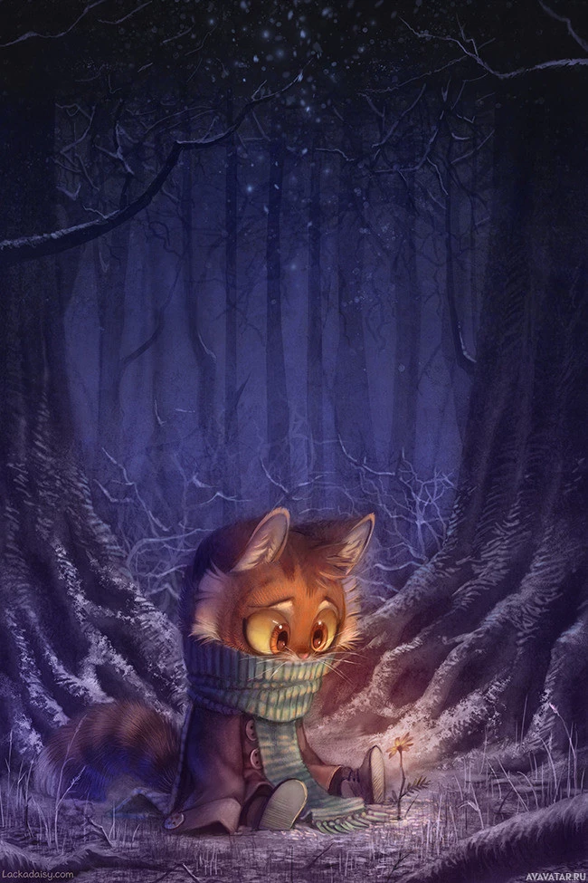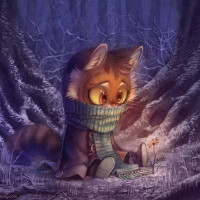 The image shows a stylized illustration of an anthropomorphic fox character sitting in what appears to be