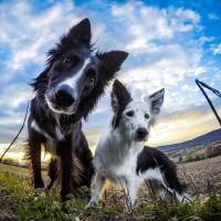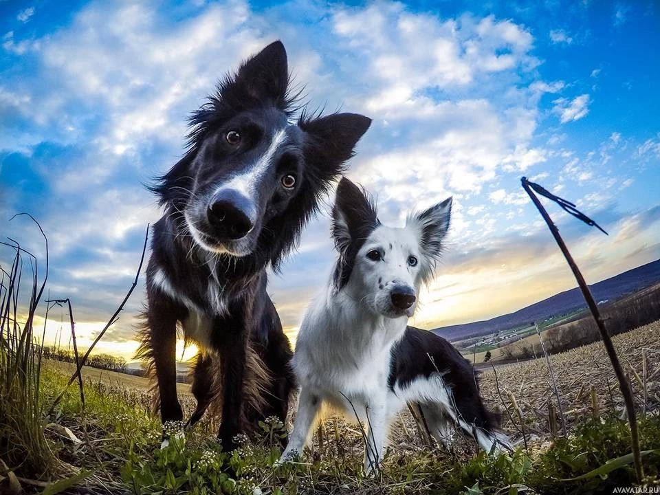 In the picture, there is an animal that appears to be a dog. The dog is standing on grass and has a surprised or curious expression. The sky in the background suggests it might be at sunrise or sunset, given