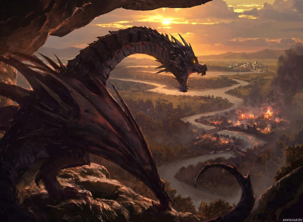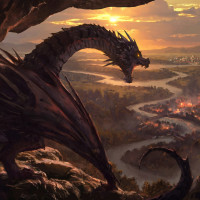 a fantasy scene featuring a dragon. The dragon appears to be perched on