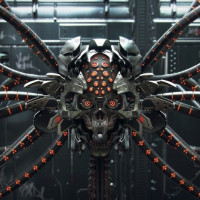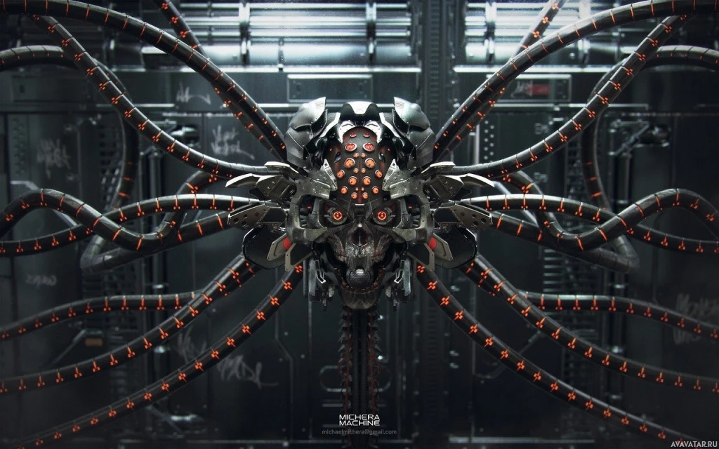 robotic construct with many arms and legs resembling an octopus or spider. The robot's head seems to be made up of various