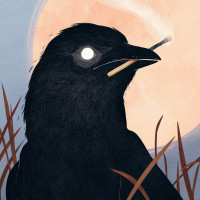 a black bird, possibly a crow or raven, perched on what appears to be grass with some dry vegetation around it. There's